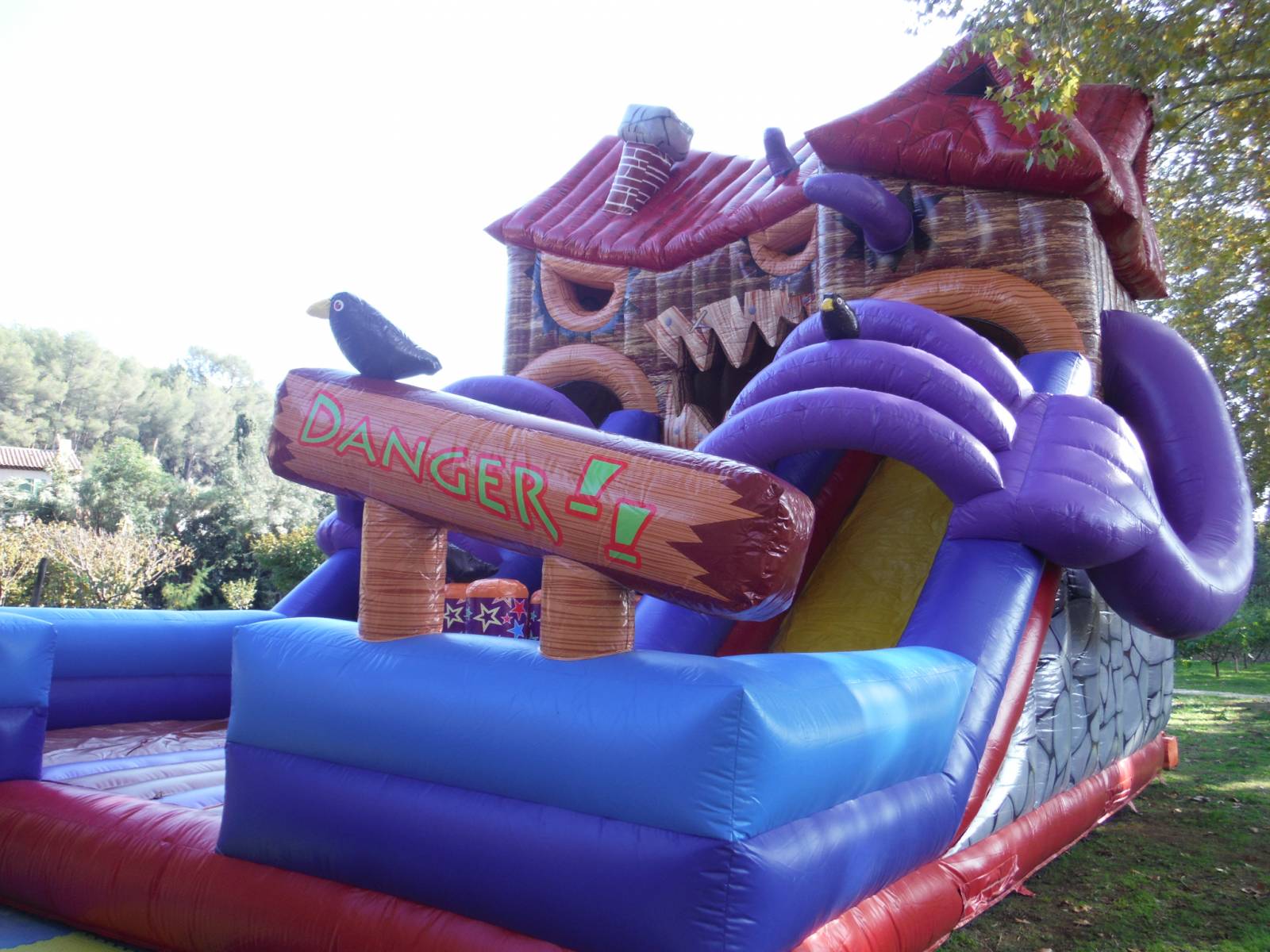 Bienvenue dans la maison de la terreur, venez découvrir cette structure gonflable gigantesque de 70m2, ou vos enfant pourrons grimper sur un immense mur d’escalade, glisser sur le toboggan de la terreur.