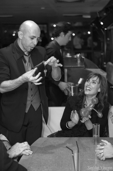 L’ambiance retombe ? Immédiatement, l’artiste crée la communication entre les convives… Une discussion sérieuse a lieu ? Le Magicien laisse la discussion se poursuivre, il reviendra un peu plus tard !