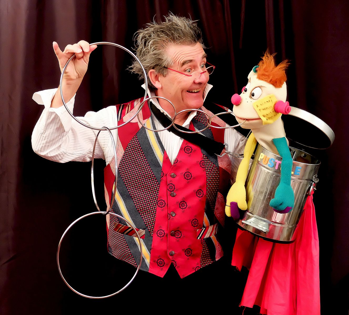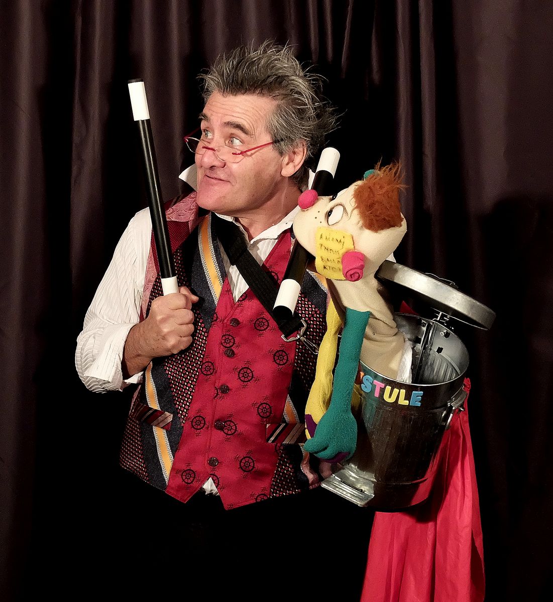 Notre magicien accompagné de personnages qui parlent vous propose des tours de magie et d'illusions ainsi que des prestations digne d'un grand ventriloque. Le public est amené à participer tout le long du spectacle : une véritable complicité se crée entre le magicien et les enfants !